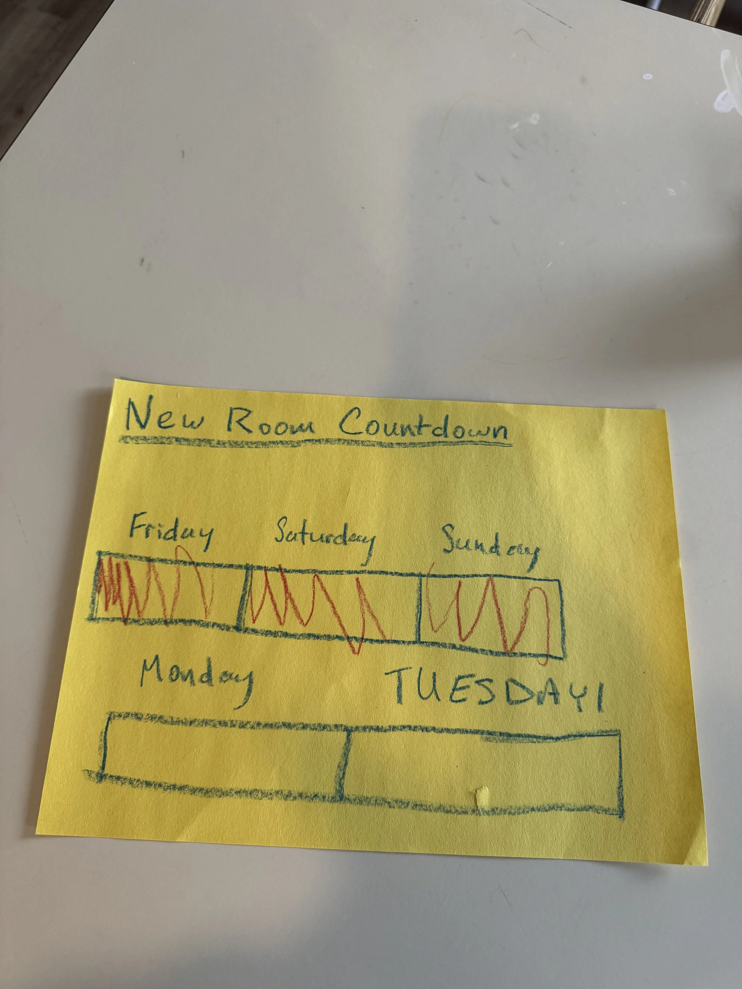 We made a simple paper countdown calendar for our older son (4.5 years). Every night, he’d cross off a day and see how many nights were left until the big room-share move. It helped make the transition feel both real and predictable — two things young kids crave.